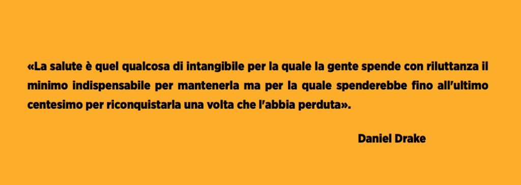 «La salute è la cosa più importante», è una frase trita e ritrita, che tutti condividiamo un po’ retoricamente, ma che di fatto resta spesso confinata nell’ambito di buoni e vaghi propositi. E proprio pensando alla salute mi è ritornato alla memoria Daniel Drake, medico americano pionieristico e scrittore che ne incorniciò la definizione in un’aforisma tanto pungente quanto vero:
